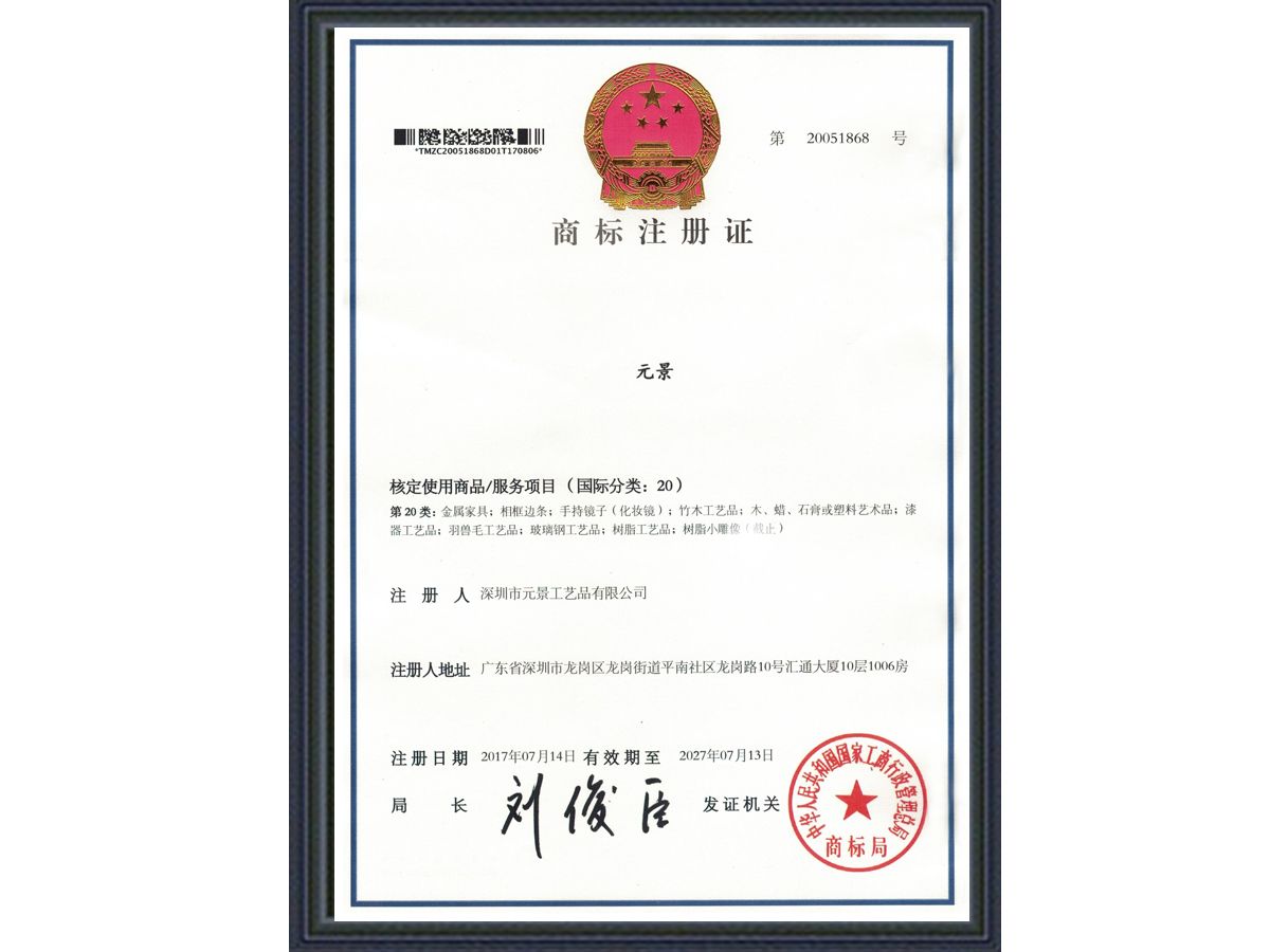 深圳市元景工藝品有限公司商標注冊證書