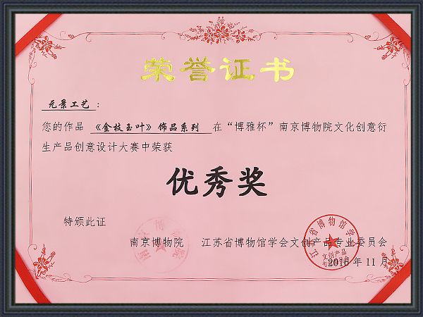 深圳市元景工藝品限公司《金枝玉葉》飾品系列在“博雅杯”南京博物館文化創(chuàng)意衍生產品創(chuàng)意設計大賽中榮獲優(yōu)秀獎